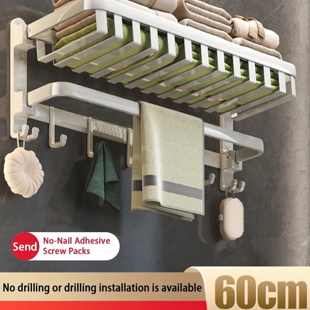 Key Features Dual-layer Foldable Design, 50% More Space-saving: Features a 90° dual-fold structure. When not in use, it can be fully folded to save space. When expanded, it provides dual-layer storage: the upper layer for toiletries and the lower layer for hanging towels, meeting multi-scenario storage needs in the bathroom. Space Aluminum Material, Durable and Sturdy: The main body is made of space aluminum, with an anodized surface treatment, offering excellent rust and corrosion resistance. It can bear 10kg-20kg, and will not deform after long-term use, making it suitable for humid bathroom environments. No-drill Installation, Compatible with Various Walls: Supports no-drill installation, which does not damage the wall and is easy to install. It also supports screw-fixed installation to ensure stability. It is compatible with various wall materials such as tiles, glass, and paint. Humanized Details: Movable Hooks: Hooks can be adjusted freely to meet the hanging needs of different items. Heightened Anti-tip Edge: The edges of the dual-layer rack are heightened to effectively prevent toiletries from sliding off. Side Anti-leak Structure: The towel rack has side baffles to prevent items from falling and improve ventilation efficiency. Luxury Cream Style, Enhancing Bathroom Aesthetics: The overall cream color and simple line design match modern, Nordic, Japanese, and other decoration styles perfectly, enhancing the overall aesthetics of the bathroom.